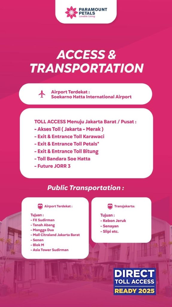 Paramount Petals menawarkan Akses Toll Langsung terkoneksi dengan Boulevard Modern Township yang Luas sehingga memberikan Kenyamanan berkendara, Tanpa melalui jalan kecil