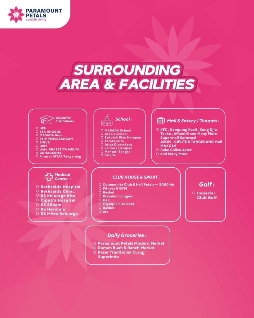 Paramount Petals menawarkan akses ke fasilitas umum dengan mudah dan dekat seperti Rumah Sakit, Hotel, Sekolah, Modern Market, Bez Walk, Country Club, Urban Plaza, Shopping Mall & Lifestyle Center.